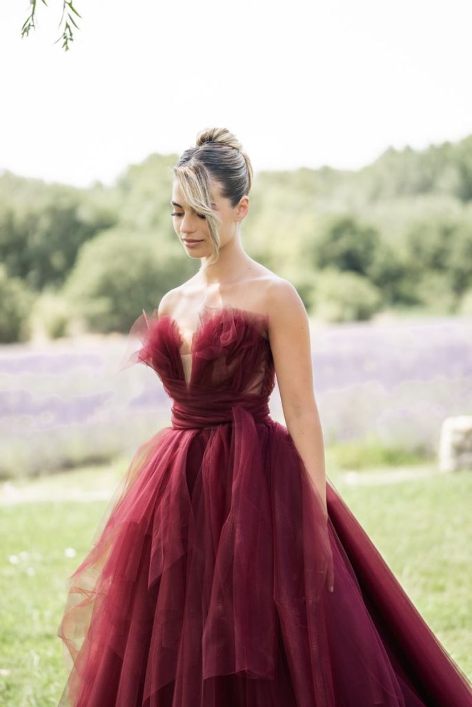 Robe de mariée bustier en tulle de couleur bordeaux