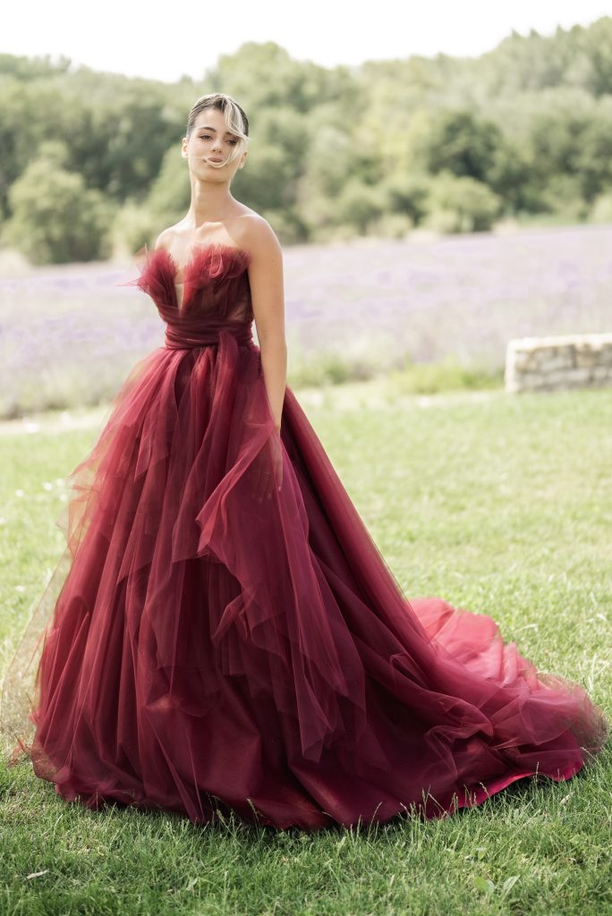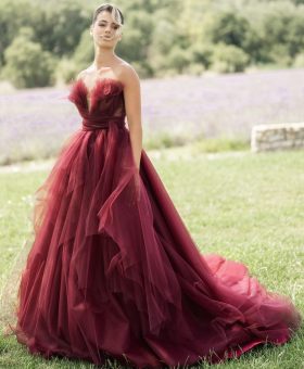 Robe de mariée bustier en tulle de couleur bordeaux
