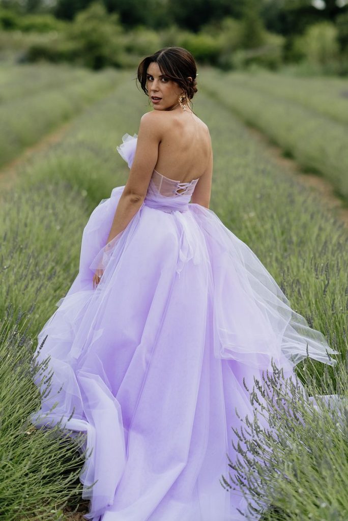 Robe de mariée bustier en tulle de couleur lavande.