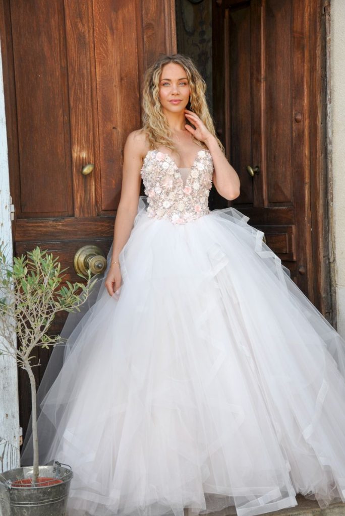 Robe de mariée de couleur rose, douceur et romantisme. Robe de mariée bustier incrusté de fleurs 3D et de perles. jupe en tulle . disponible également en tout ivoire