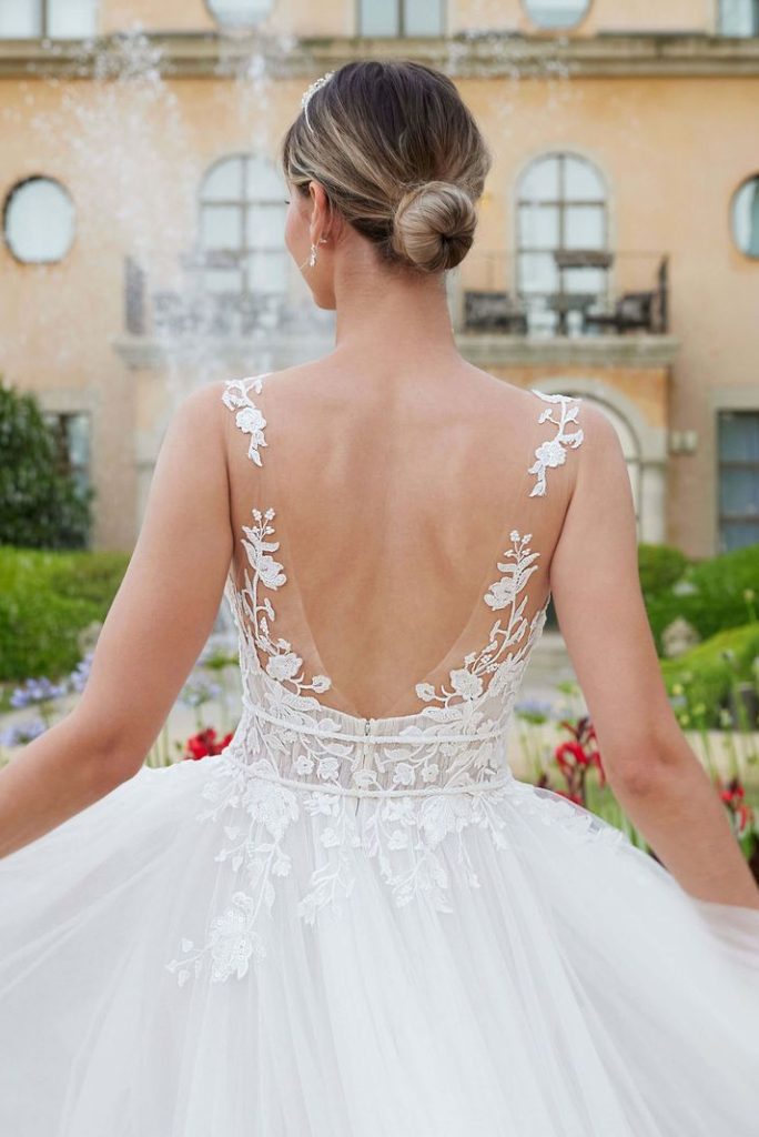 une robe de mariée tout en finesse jupe en tulle mousseline pour un petit volume tout en fluidité. Bustier entièrement incrusté de petites feuilles, le grand décolleté dans le dos apporte de la modernité à la tenue.