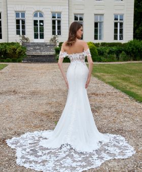 robe de mariée sirène dentelle et satin avec magnifique traine en dentelle